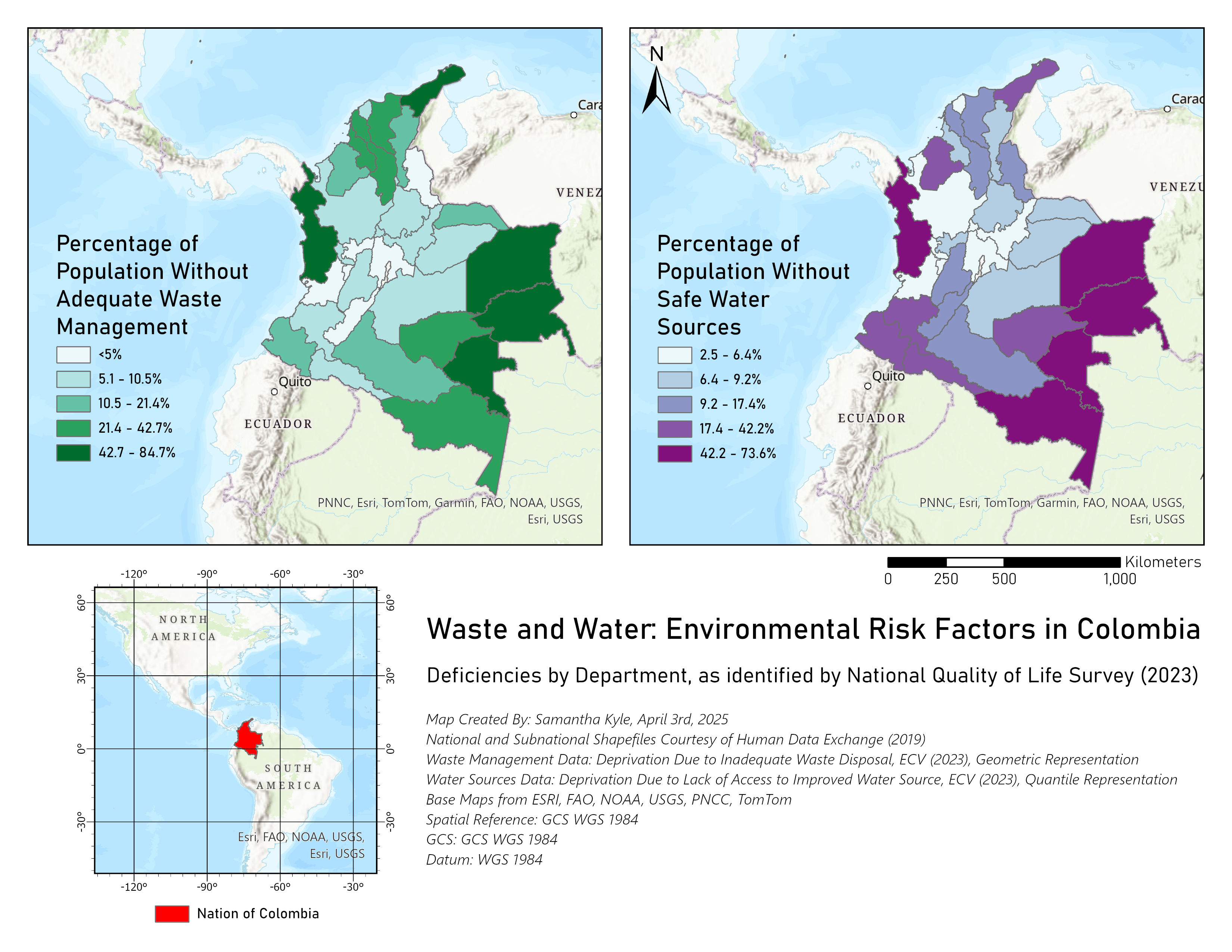 Using Colombia's national survey on public service provision, this map highlights the interconnectedness of water and waste management deprivation as compounding environmental risks in the country's peripheries.