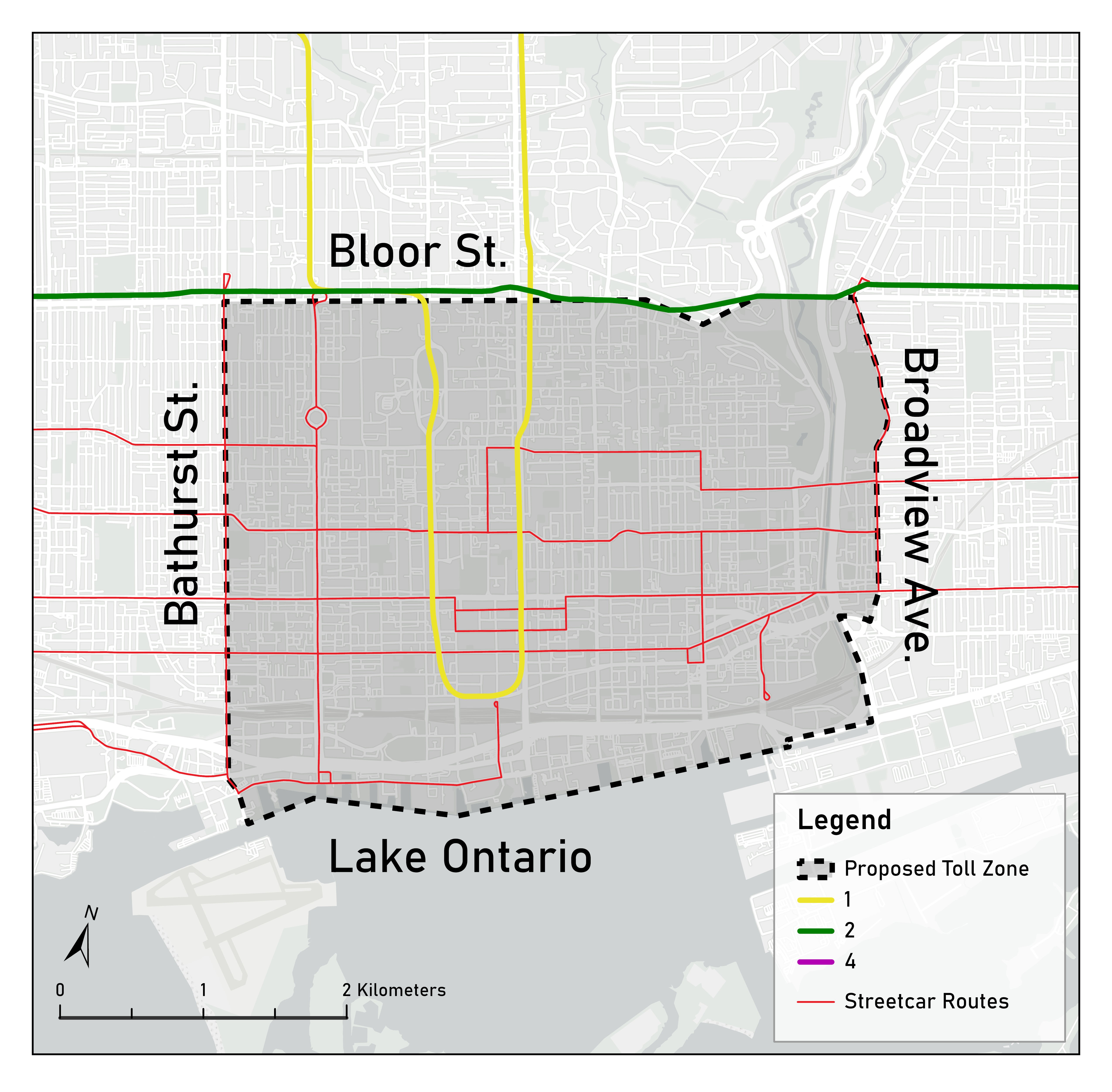 This visual supports a policy suggestion for open-area cordon tolling of Toronto's downtown streets to mitigate congestion and gridlock.