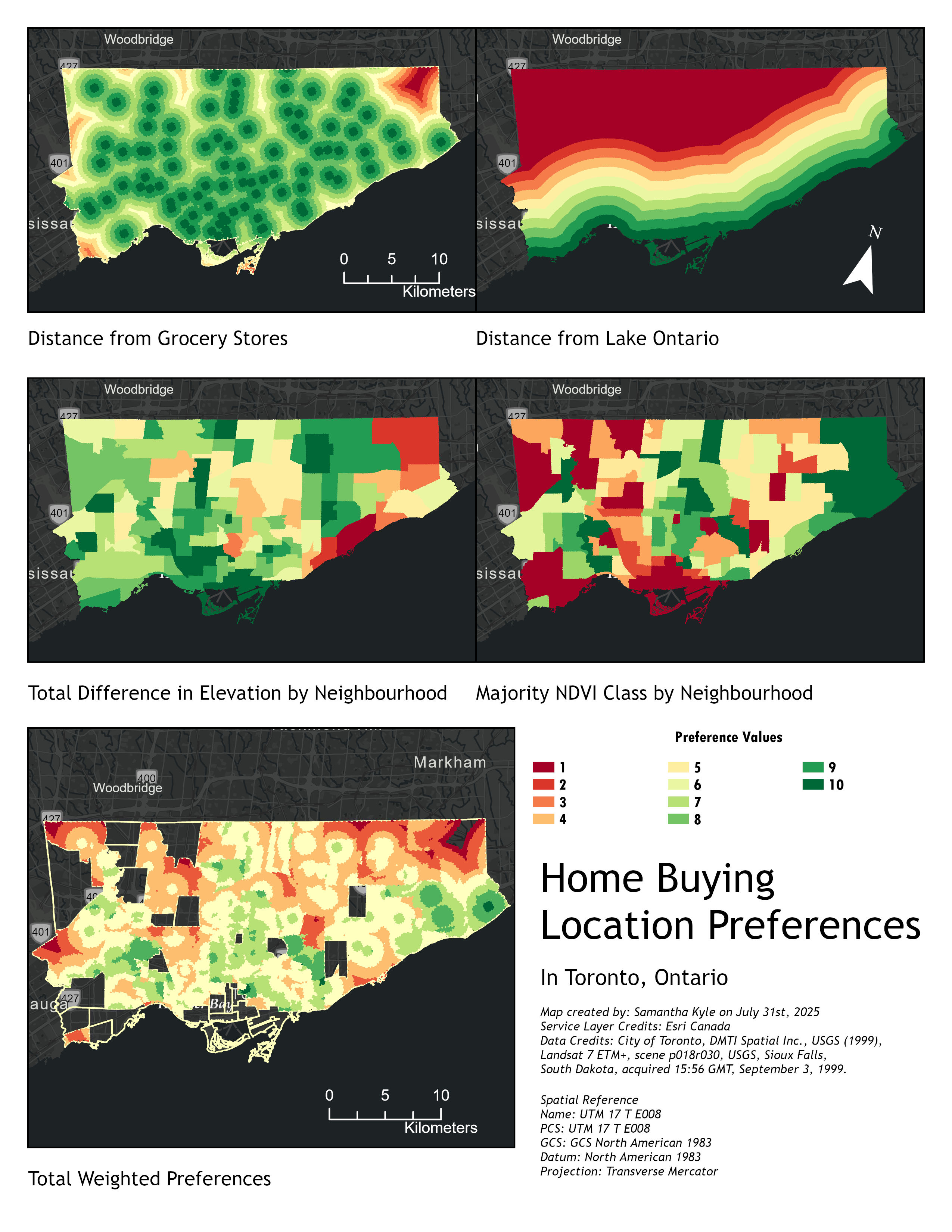 Suitability analysis on home buying preferences combining remote-sensing tools, DEM data, and raster and zonal statistics to create heat map of location desirability.
